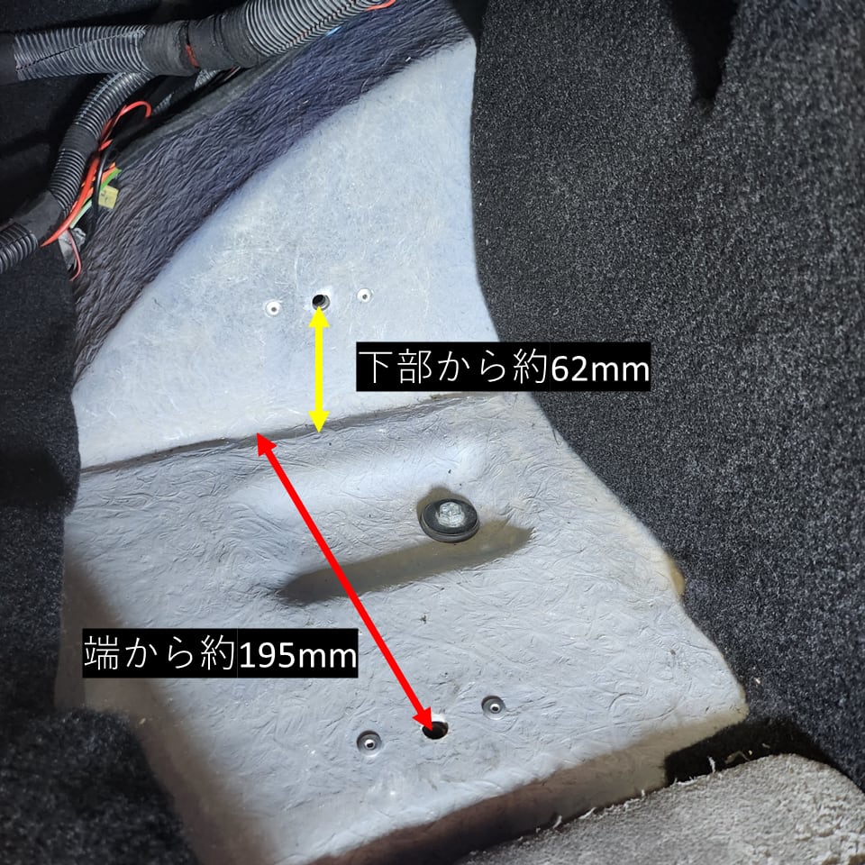 ・ボルトの位置が画像4と5枚目にあるように、下部から約62mm、端から約195mmにボルト穴があれば取付け可能です。